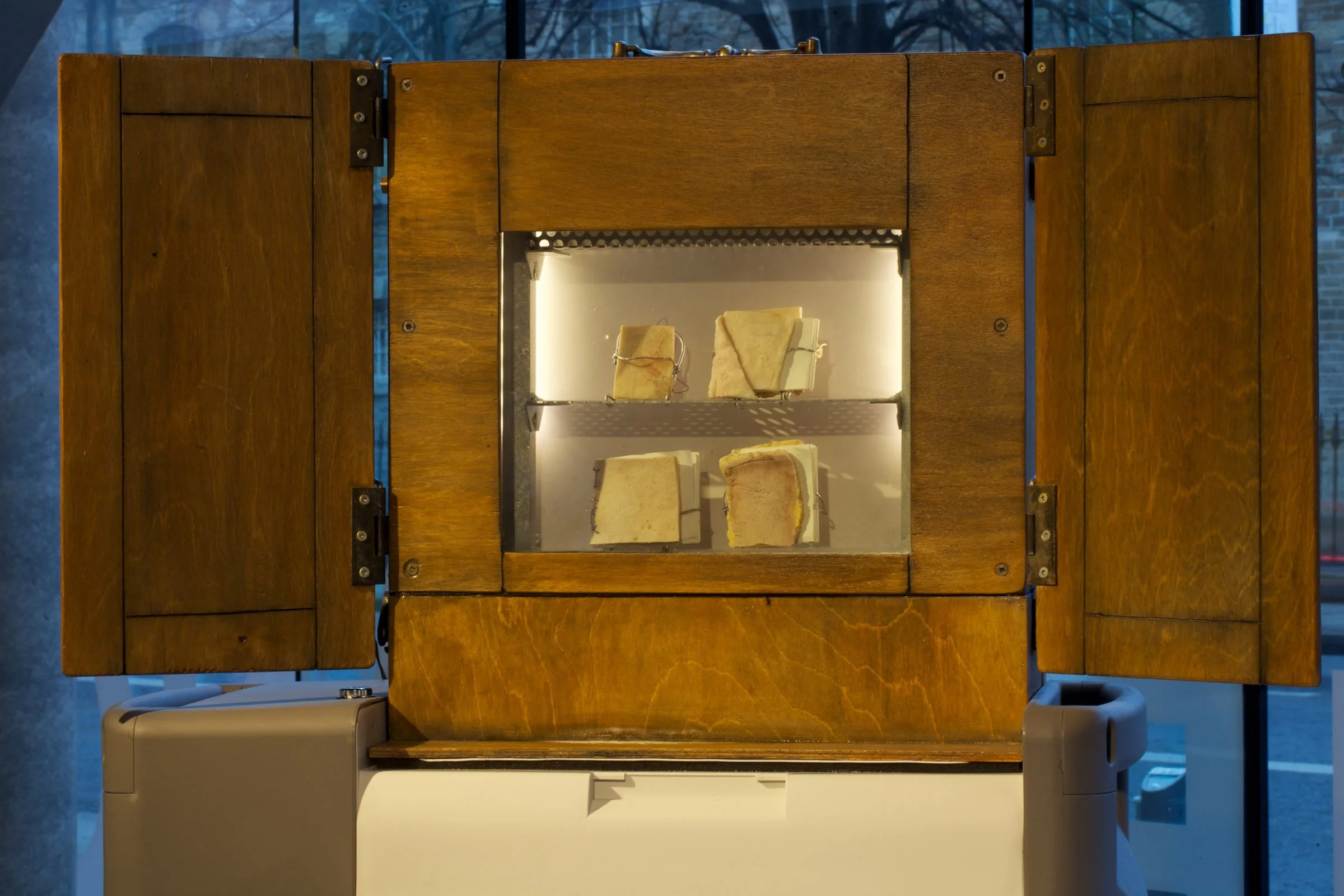The cryounit allows for the books to be mobile and portable so that they may be taken outside for a walk, shown to friends, neighbors and strangers outside of the context of the gallery, the library and science lab. This mobility is intended to visually highlight the deeply embedded and often hidden relationship between viral tissues and the information economy.