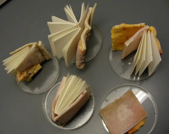 In this work, skin tissue from human and pig is remixed in the form of the book creating an unexpected configuration and assemblage. The practice of binding books with plant and animal tissue is familiar, however the idea of books bound with human tissue is less so, and also fraught with discomfort and suspicion, especially from a western perspective with distant memories of grave robbing for body parts and the contemporary concern around the practice of the black market and organ trade. The cryobooks reference anthropodermic bibliopegy, the practice of binding human skin on books, performed by medical surgeons in Europe since the 1600's. Surgeons used to bind anatomy books with the skin of deceased patients as a form of preservation intended to literally archive and honour the deceased patient's body. More than vehicles of information, these books spoke to the embodied, visceral and lived life of a body- a reminder that bodily tissues and organs are both material and immaterial histories, subjectivities and impersonal qualities.